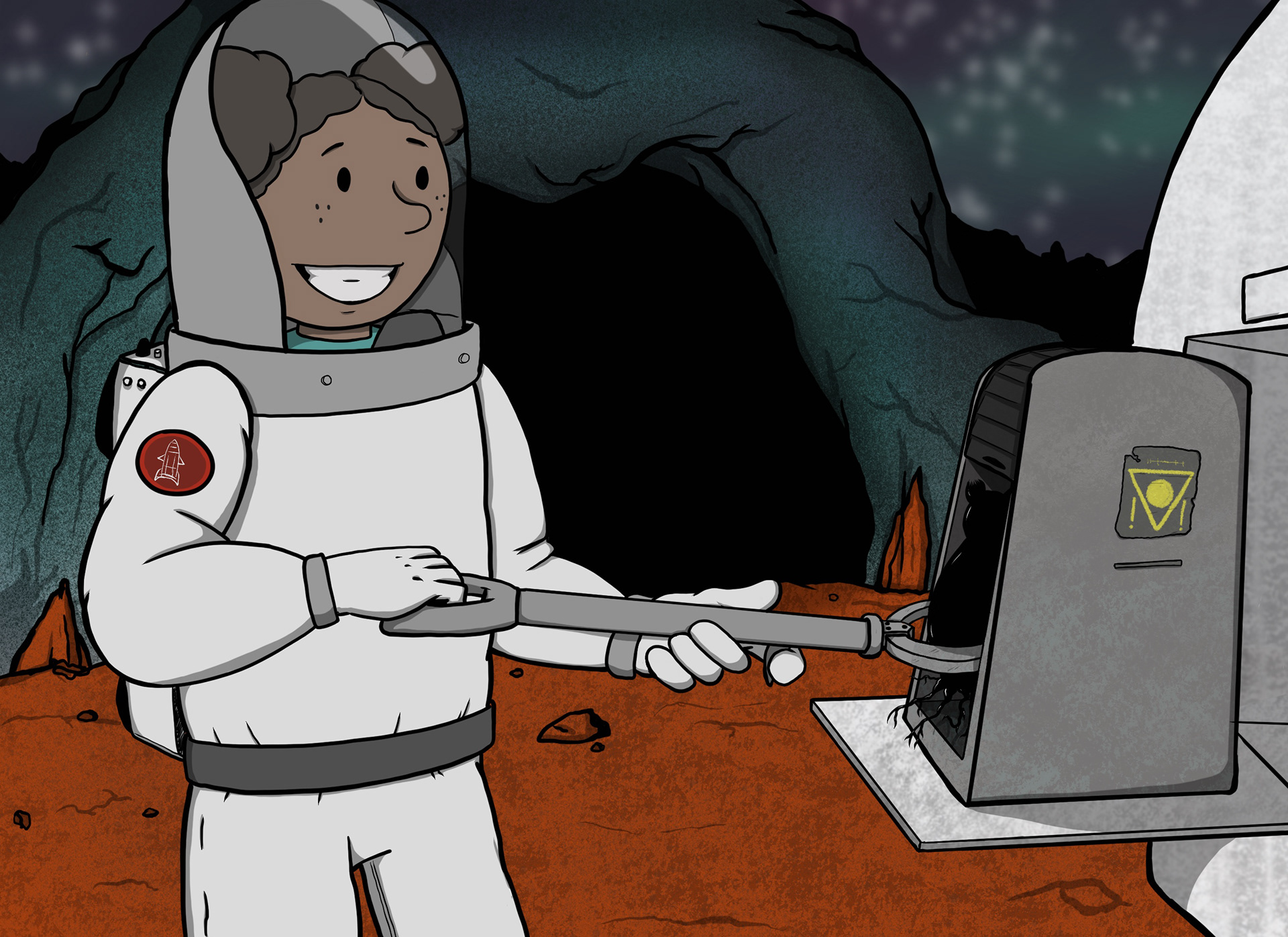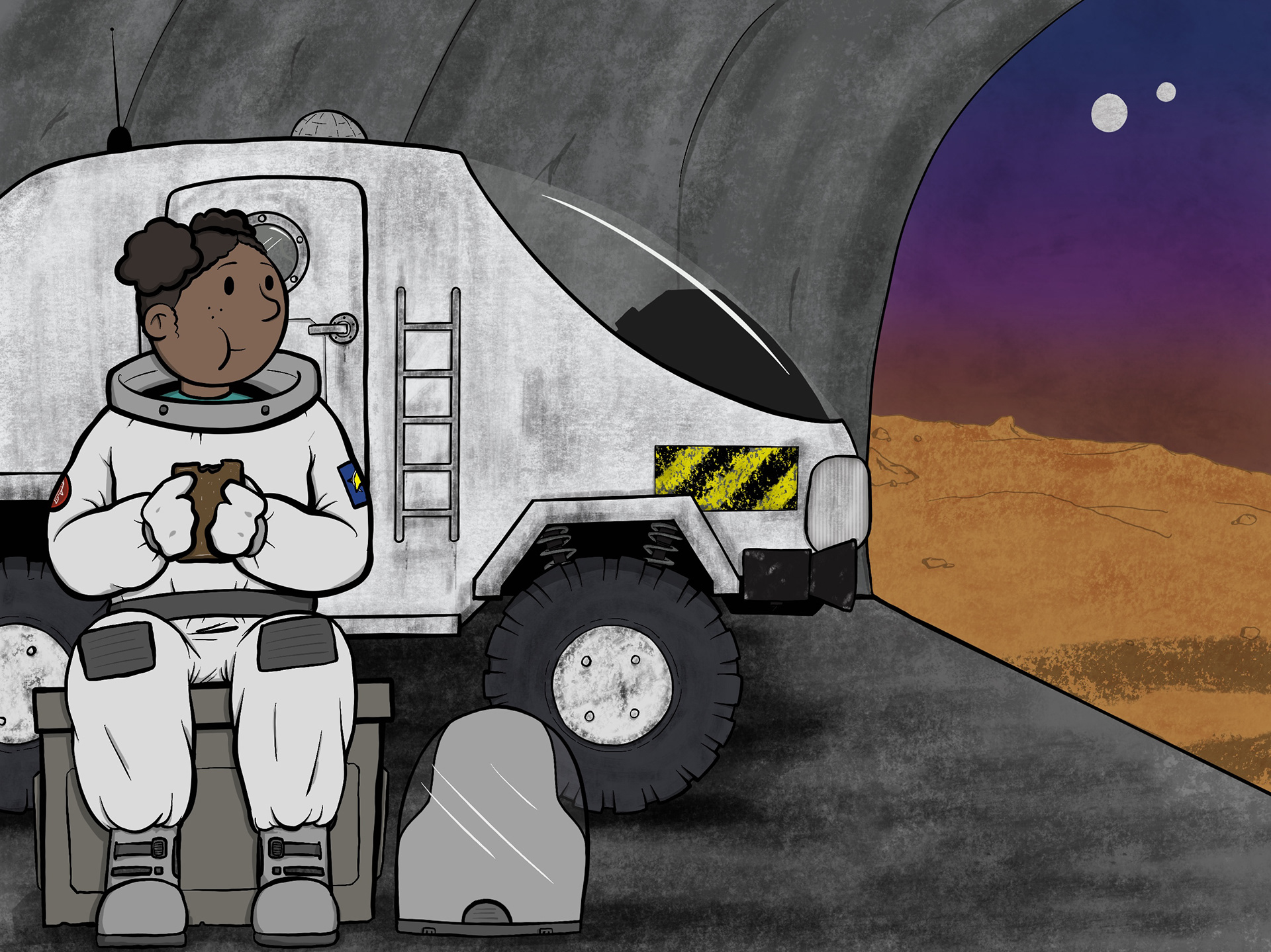 ‘Home From Home’ was a personal illustration project, in which I challenged myself to try and tell a story with no written narration. The story depicts a space cadet on an alien planet, going about either her daily routine or a specific mission, and it suggests that she is looking for some kind of new and potentially dangerous life form. The final panel shows her with her latest find - a type of succulent plant. The idea is to convey that she has discovered a way to continue the things she enjoyed on earth, in her new habitat. This 4-panel illustration was exhibited at the OXO Tower in London in 2017.